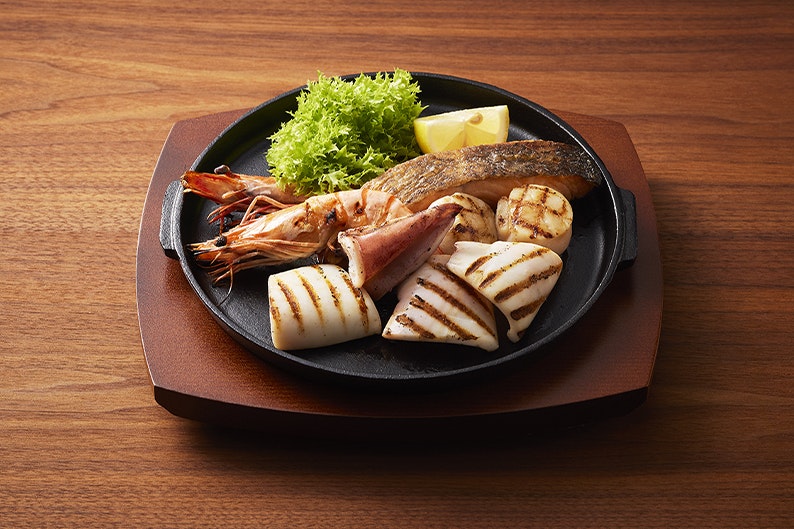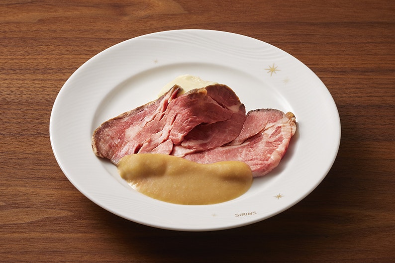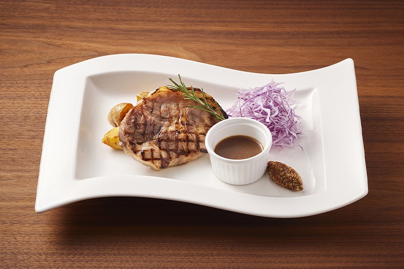 ガーリックとハーブでマリネしたやまゆりポークのコンフィグリル フォンドヴォーソースと粒マスタード