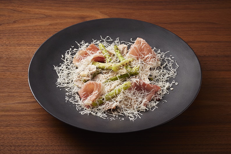 ブラウンマッシュルーム アスパラガス ハモンセラーノ トリュフドレッシングの前菜 ペコリーノチーズ
